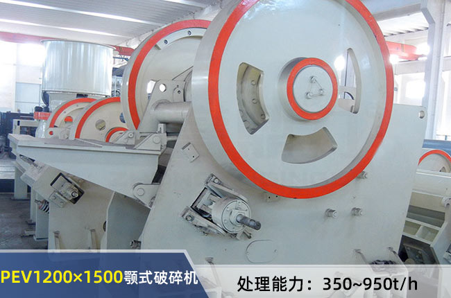 PEV1200×1500颚式破碎机进料粒度要求<1020mm,排料调整范围180-340mm,时产能350-950吨之间,配备电机功率为160-200千瓦,重量为83吨。