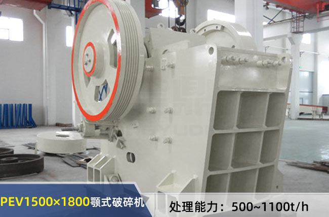 PEV1500×1800颚式破碎机进料粒度<1250mm,出料大小在210-360mm之间,时处理能力500-1100吨,电机功率是280千瓦,外形尺寸7460x6240x4250mm,重122吨。